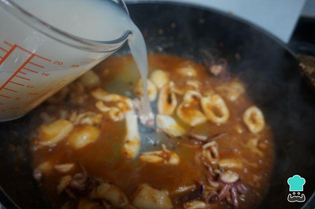 Cuela el caldo de pescado y añade 1 litro de caldo aprox. en la cazuela. Deja que se cocine unos 10 minutos todo.